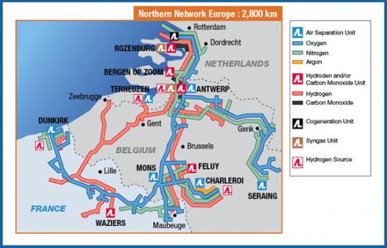 In some specific cases, a hydrogen refuelling station is located nearby or on top of a hydrogen pipeline. In that case, the hydrogen only needs to be compressed, cooled and dispensed. For example in Belgium and a part of the Netherlands a hydrogen-pipeline network, operated by Air Liquide, exists with total length of about 900 kms, running from Rotterdam (NL) via Antwerp (B) to Dunkerque (F). The pressure level within this pipeline system is approximately 70-100 bar and can be compressed and stored on-site at various pressures, to fill the different applications at the desired pressure.